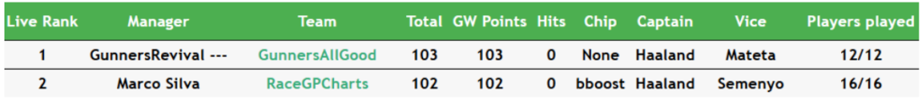 GunnersRevival — was the highest scorer because of double-digit hauls from captain Erling Haaland (£14.8m), Declan Rice (£6.8m), Gabriel Magalhaes (£6.6m), Moises Caicedo (£6.0m) and Marc Guehi (£5.0m).