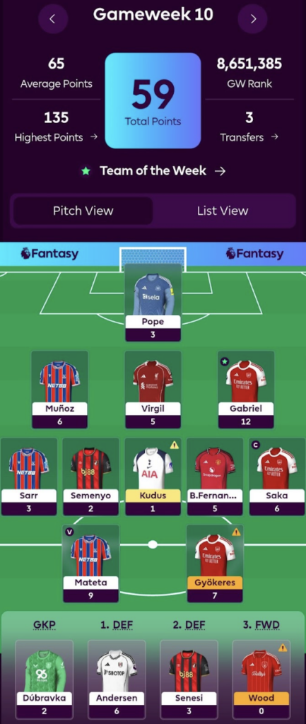 Not owning an Arsenal defender until Gameweek 10 should be a criminal offence. When it comes to reviewing the season, that will be one of the key takeaways. I was too cautious with Mikel Arteta’s remarks about Gabriel being a fitness concern on two occasions. I should’ve just pulled the trigger on him and relied on the bench if required. Lesson learned.