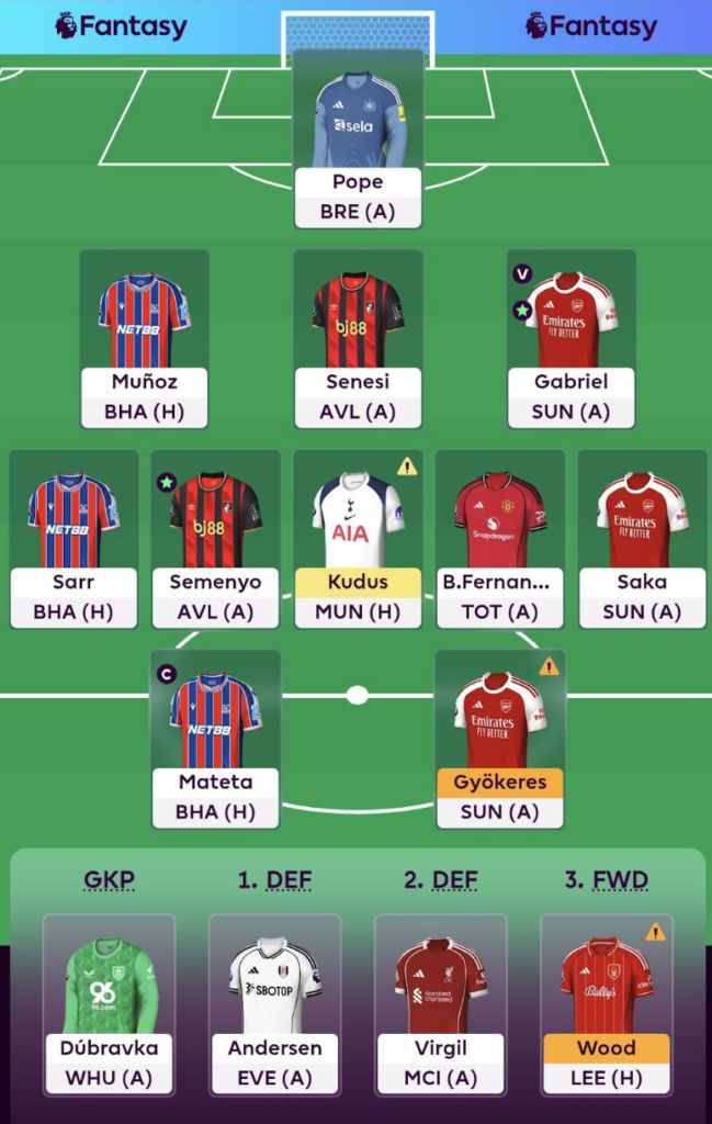 Three free transfers were used last week to bring in Gabriel Magalhaes (£6.6m), Ismaila Sarr (£6.6m) and Jean-Philippe Mateta (£7.9m). Those to make way were Pedro Porro (£5.5m), Matheus Cunha (£7.9m) and Joao Pedro (£7.4m).