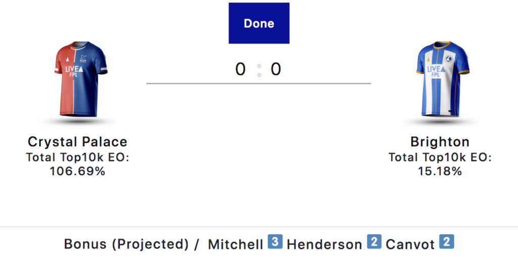 | Crystal Palace | 0 – 0 | Brighton and Hove Albion |