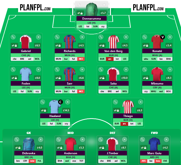 We’ve moved David Raya (£5.9m) to Jurrien Timber (£6.1m) to accommodate the (hopefully) safest route into the City defence, Gianluigi Donnarumma (£5.7m), but Josko Gvardiol (£5.8m) is, of course, an alternative. The downside to City defenders is a shortage of DefCon points, while Donnarumma seldom gets save points. Both could be avoided if desired.