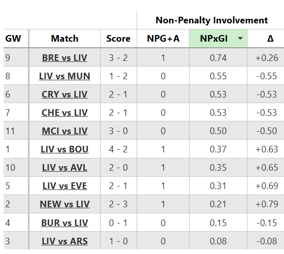 Mohamed Salah‘s (£14.2m) underlying numbers are improving, at least. If we look at a weekly breakdown of his NPxGI figures (below), there’s a clear upswing in the last six Gameweeks: