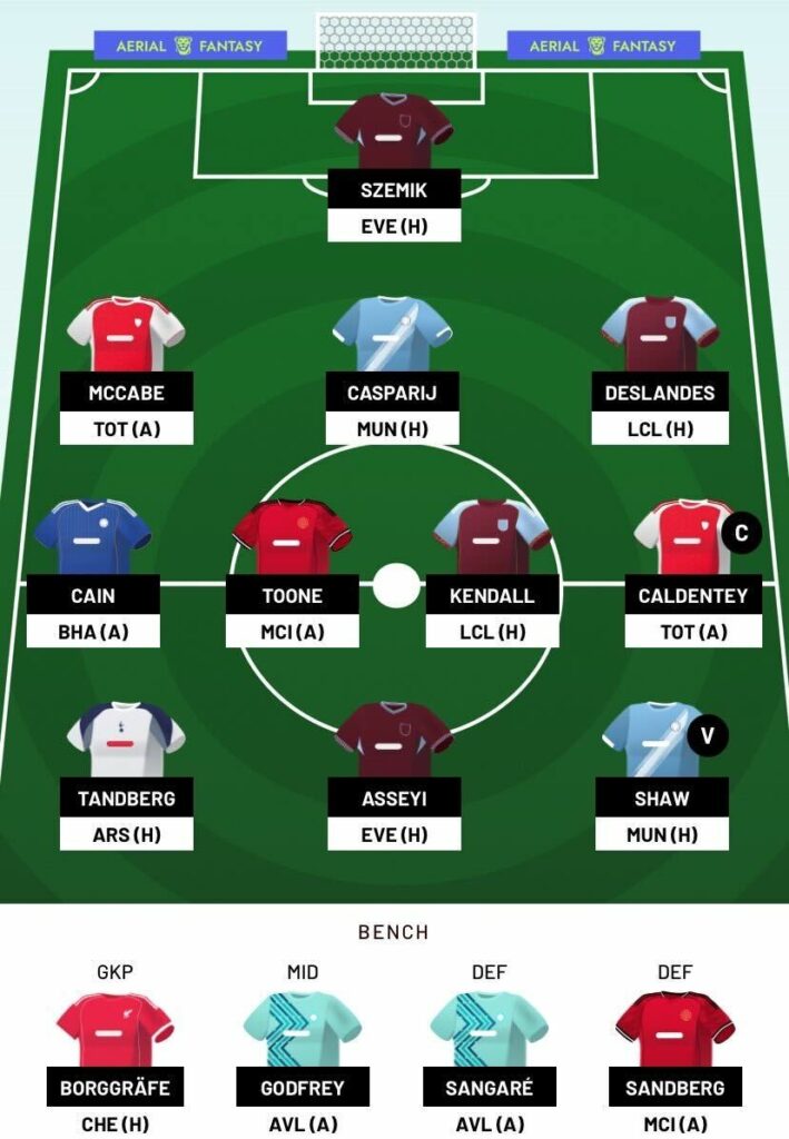 Katie McCabe (£8.0m), Kerstin Casparij (£7.3m) and Oceane Deslandes (£6.0m) line up in my defence. McCabe has been underwhelming for me this season and her early substitutions are worrying. Despite a tough fixture, Casparij’s attacking threat remains invaluable. Aston Villa’s strong defensive performance against Man United last weekend makes Deslandes an exciting pick at home to London City.