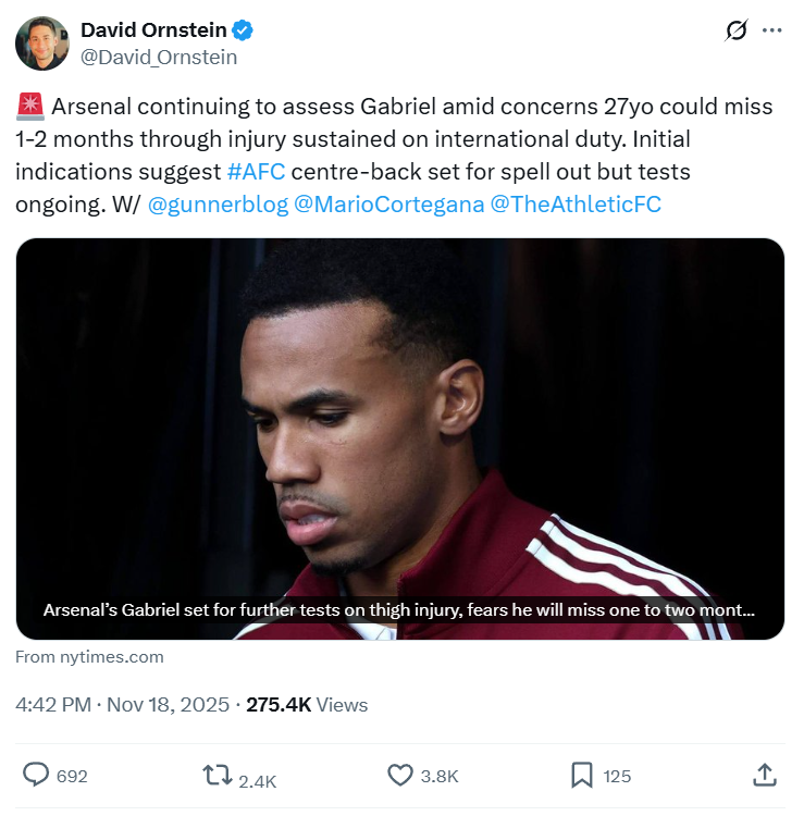 There’s reportedly not too much concern over Calafiori, however, so Gabriel is the biggest worry.