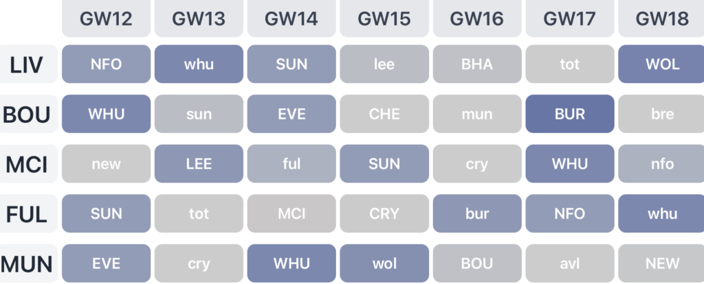 And in actuality, when you limit the Fixture Ticker to look just at Gameweek 12-18, Bournemouth sit second behind only Liverpool based on overall fixture difficulty.