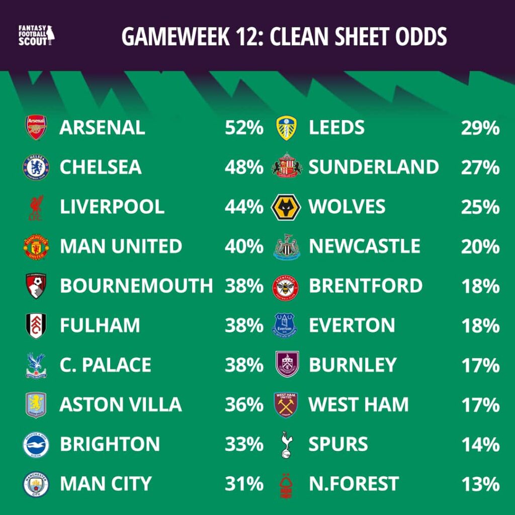 GAMEWEEK 12 CLEAN SHEET ODDS
