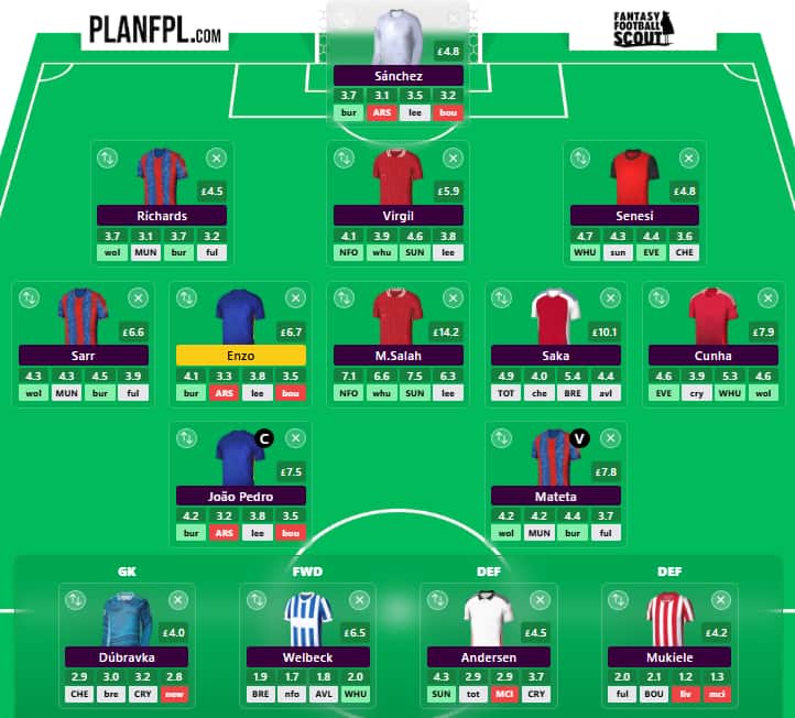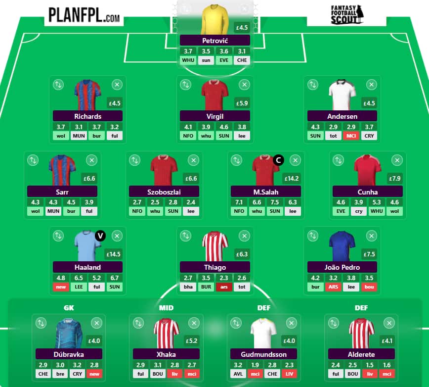 Choosing Robert Sanchez (£4.8m) over one of Chelsea’s defenders avoids the rotation risks in their backline, while Szoboszlai offers reliability as he continues to start every match for Liverpool. Holding Semenyo as cover, maintaining the Arsenal defence, and including highly owned options such as Joao Pedro (£7.5m) and Jean Philippe-Mateta (£8.1m) also fall firmly into the “safe” category.