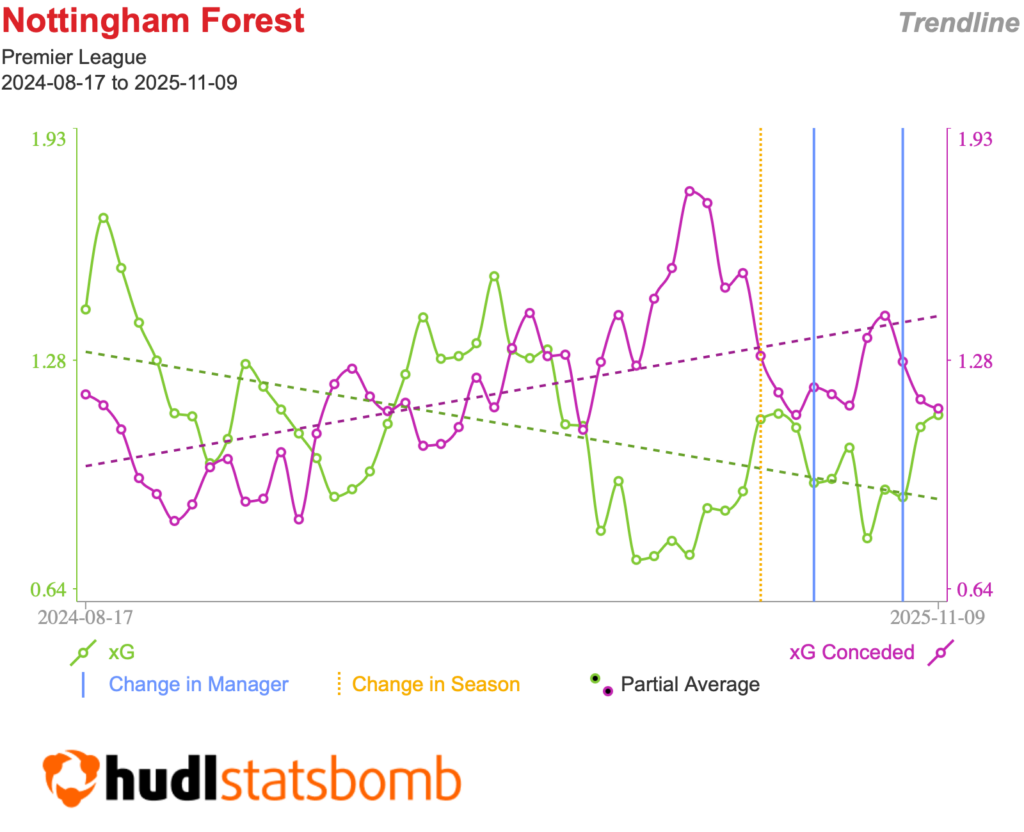 Above: Nottingham Forest’s six-match xG/xGC trendline since the start of last season