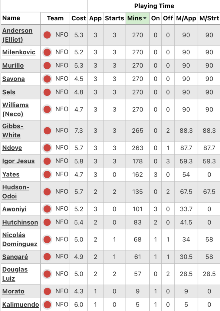Above: Nottingham Forest players sorted by minutes played under Sean Dyche