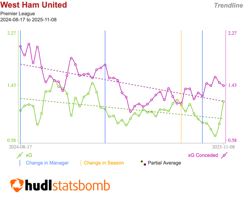 Above: West Ham’s six-match xG/xGC trendline since the start of last season