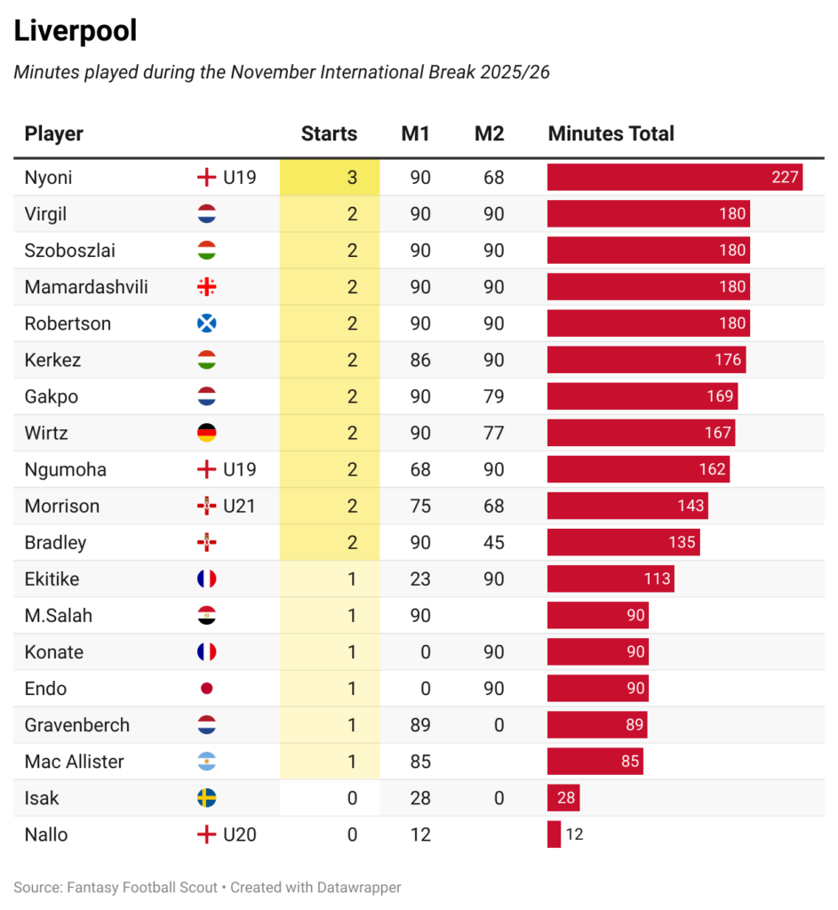 Please note that any gaps in the M2 column should be because a player didn’t appear in the matchday squad in one of their country’s two internationals (not necessarily the second game).