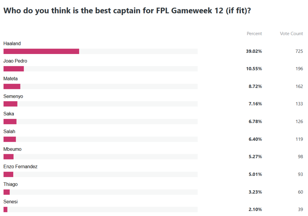 As is customary, Haaland leads the Fantasy Football Scout captaincy poll. Just over 39% of site users believe the Norwegian, who has scored 14 goals in 11 league starts, is the best option for Gameweek 12.