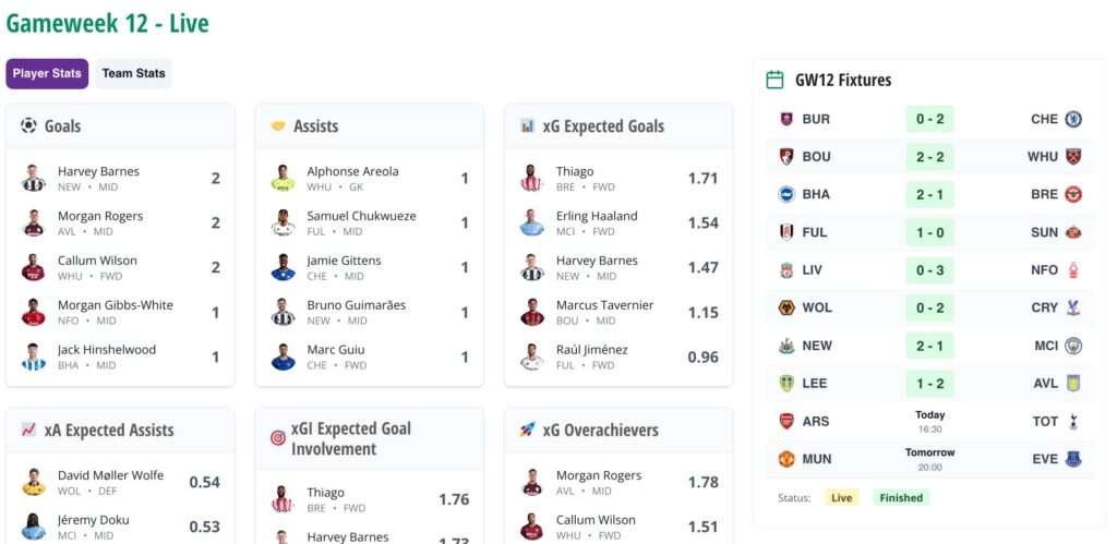 Here you can follow the scores, watch the defensive contribution (DC) points roll in, see who the leading players are for xG and more as the games play out, as seen below: