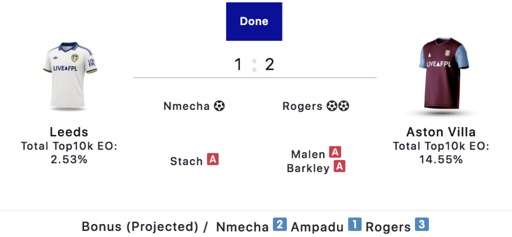 With Leeds dominant in the first half (more on that later), Emery made a double substitution at the break, with Ian Maatsen (£4.2m) and Donyell Malen (£5.1m) replacing Lucas Digne (£4.5m) and Emiliano Buendia (£5.3m).