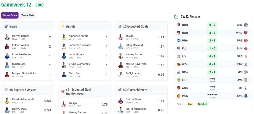 Here you can follow the scores, watch the defensive contribution (DC) points roll in, see who the leading players are for xG and more as the games play out, as seen below: