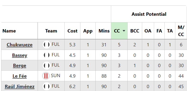 The Mexican eventually prodded in a Samuel Chukwueze (£5.3m) cross to hand Fulham all three points. Chukwueze had been introduced on the left wing in the second half and turned in an excellent cameo, creating a match-high five chances (CC, below) in barely half an hour of game-time.