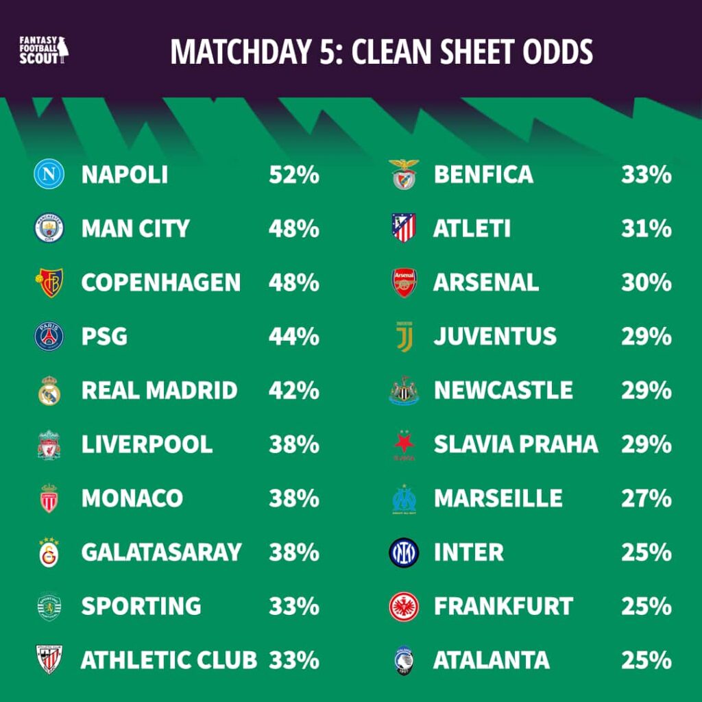Further down the list, Liverpool, Monaco, and Galatasaray all rate well for a clean sheet. Each side has been inconsistent defensively this season, but all three meet favourable opponents on Matchday 5, boosting their potential for returns.