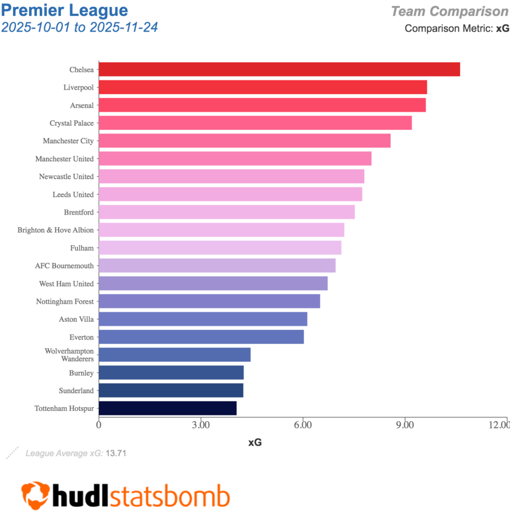 Above: Teams sorted by expected goals (xG) over the last six Gameweeks