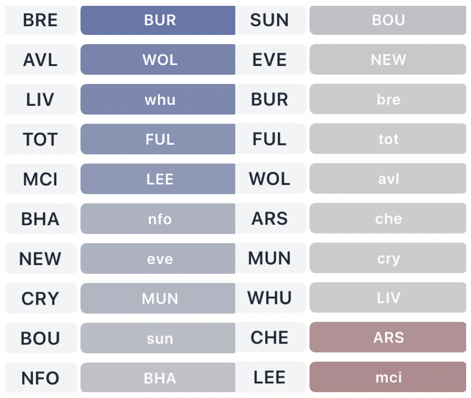 Above: The Gameweek 13 fixtures sorted by difficulty (easiest left, trickiest right) on our Fixture Ticker.