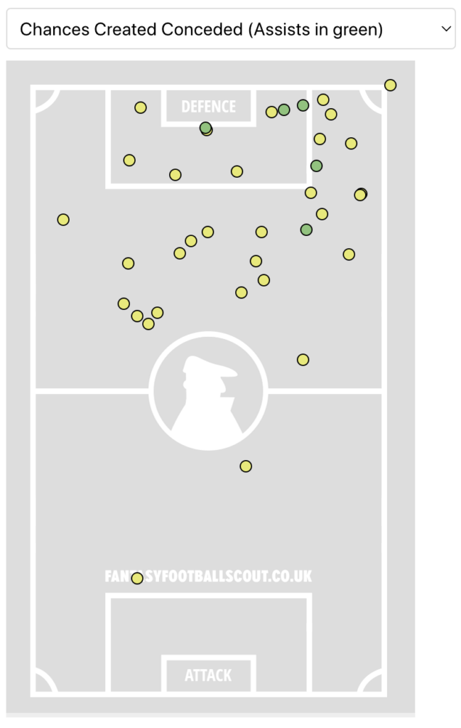 Above: Where Leeds have conceded key passes (and assists) from over the last four Gameweeks