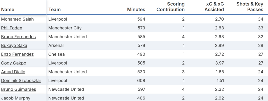 Salah’s underlying numbers have also shown improvement recently. In fact, the Egyptian is FPL’s leading player for shots and key passes combined since the start of October: