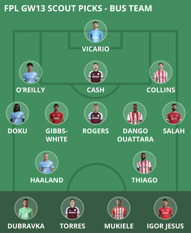 Nico O’Reilly (£5.0m), Jeremy Doku (£6.5m) and Erling Haaland (£14.9m) feature in our Scout Picks ‘bus team’, but there are other players under consideration, such as Gianluigi Donnarumma (£5.7m) and Phil Foden (£8.0m).