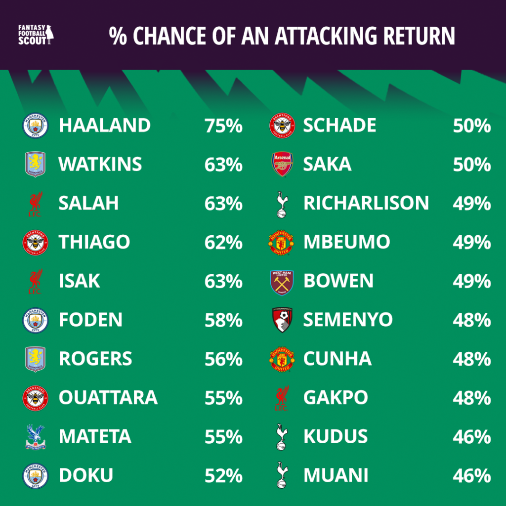 Brentford feature heavily in this week’s graphic, which is unusual, but their home fixture against promoted Burnley goes a long way to explaining why. As a result, striker and penalty taker Igor Thiago (£6.5m) completes the top four for projected attacking returns. His teammates, Dango Ouattara (£6.0m) and Kevin Schade (£7.0m), also place comfortably inside the top 20.