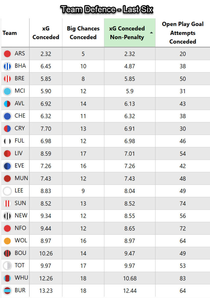 Their defensive numbers have been poor, though. They sit mid-table for non-penalty expected goals conceded (NPxGC, 7.01) and have allowed a whopping 17 big chances. That’s just one fewer than West Ham and Burnley.