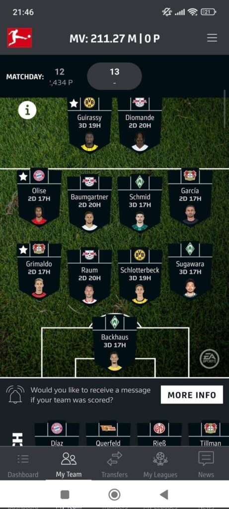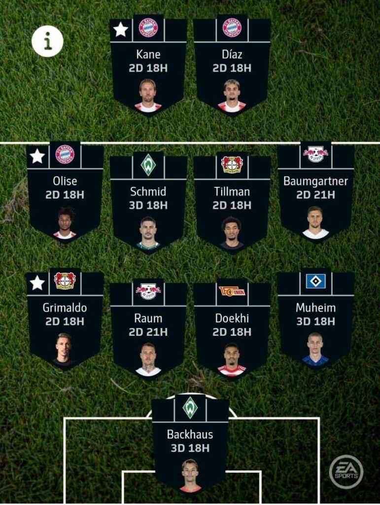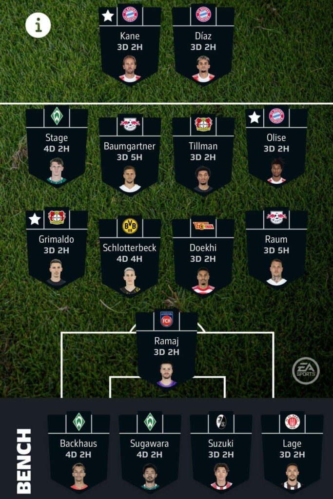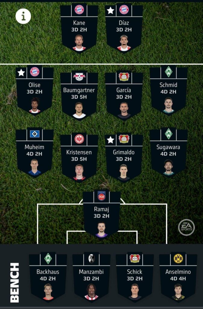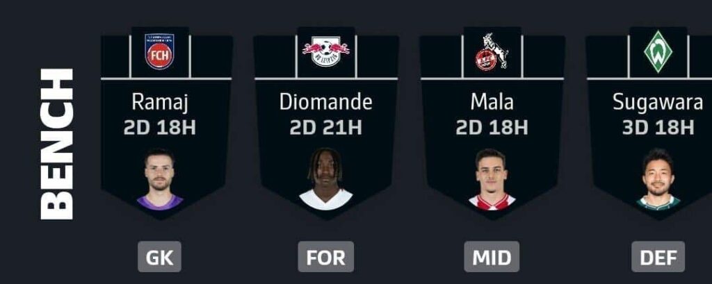 - Forwards: Harry Kane* (28.2 – FCB), Luis Díaz (23.68 – FCB) & Mohamed Diomandé (8.53 – RBL). If there is no expected rotation following Bayern’s DFB-Pokal match against Union Berlin, my forward line will likely remain unchanged. However, if a transfer becomes necessary, I could keep Marco Pieper and avoid buying Sugawara in order to free up a move.