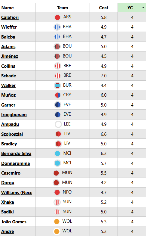 There are 40 others who have a bit more breathing space on three yellow cards.