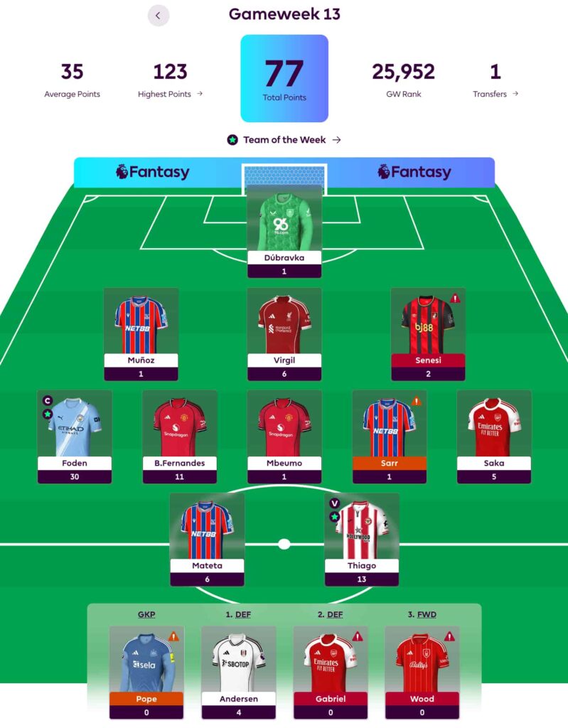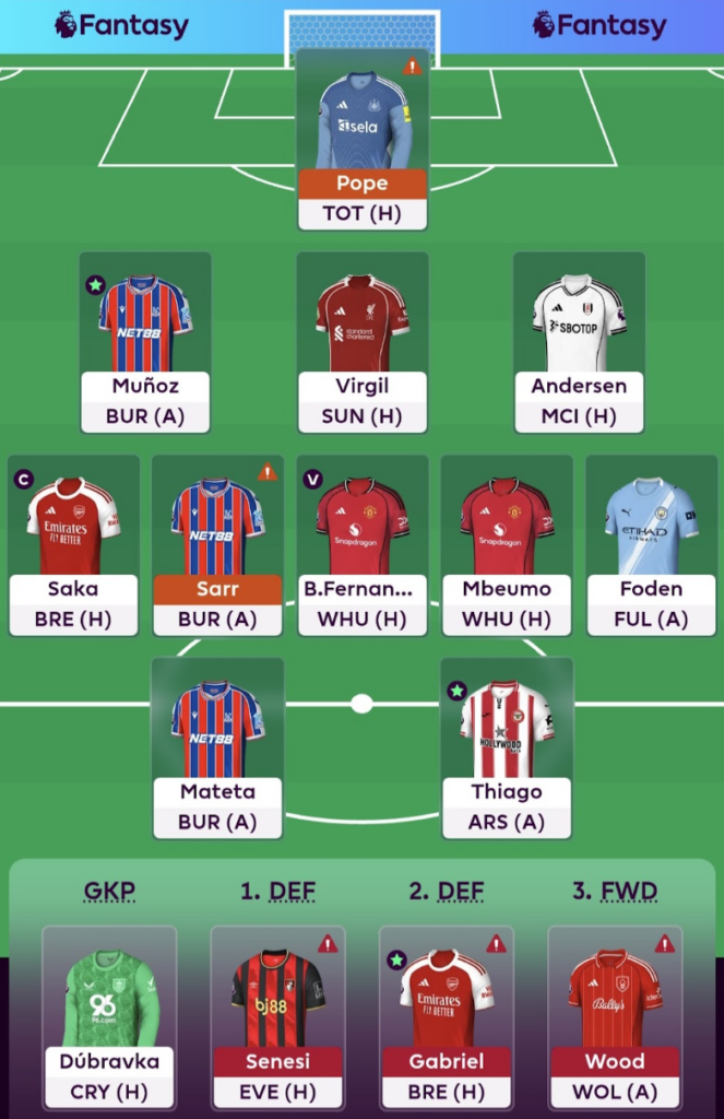 It was good to see Virgil van Dijk (£6.0m) finally register a clean sheet. Bruno Fernandes (£8.9m) chipped in with a brace of assists and three bonus points while Igor Thiago (£6.7m) continued his rich vein of form with a brace against Burnley. That’s 11 goals in 13 league games for the Brentford frontman. As I’ve got no fit Arsenal defenders or David Raya (£5.9m) at the moment, I’m hoping Thiago wipes the clean sheet midweek!