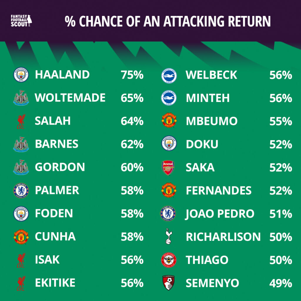 Newcastle players feature heavily among the top five player percentages this week. All three of Nick Woltemade (£7.4m), Harvey Barnes (£6.4m) and Anthony Gordon (£7.2m) look well placed to either score or assist against promoted side Burnley in the upcoming Gameweek. A reminder that these odds are effectively assuming a player will start – and Barnes and Gordon are potentially competing for one slot.