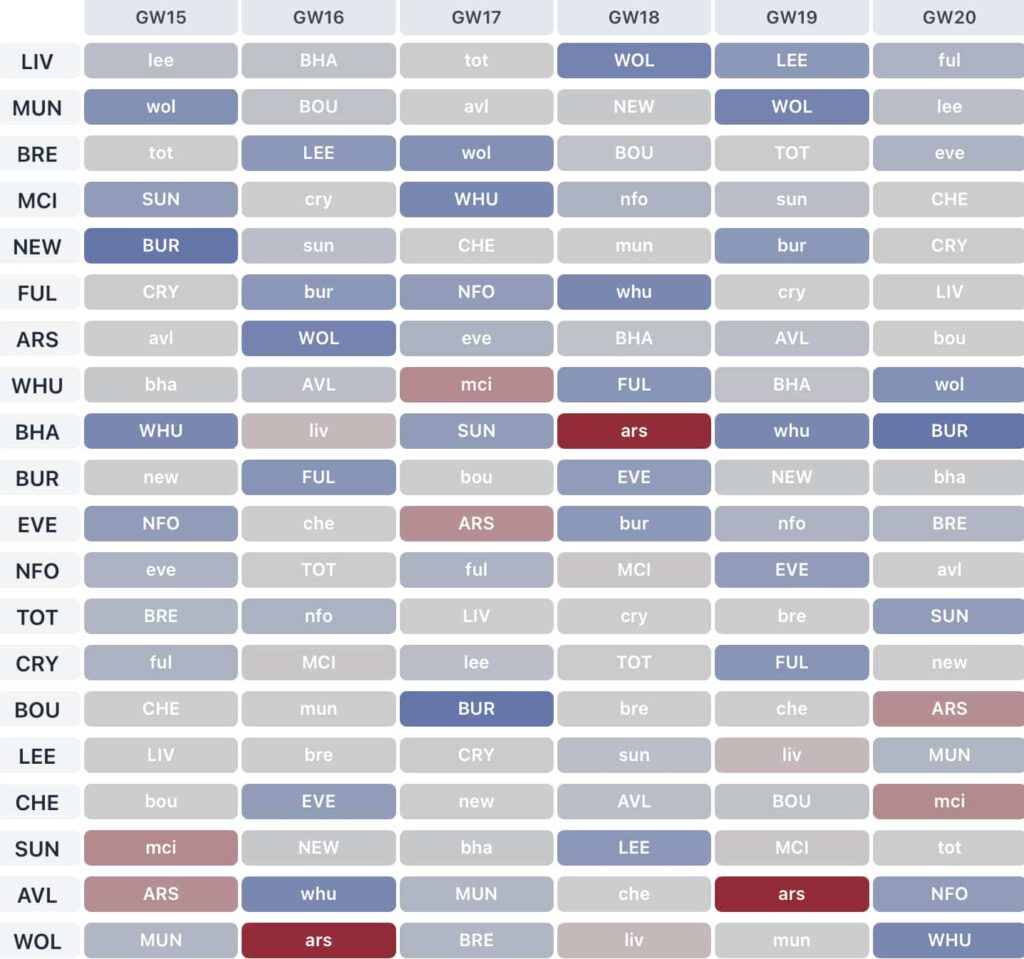 Starting with the former approach, here’s how our trusty Fixture Ticker gazes upon the Gameweek 15 schedule when sorted by expected match difficulty: