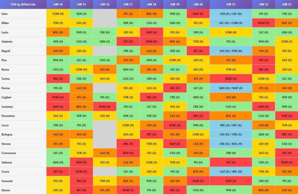 Serie A Fantasy Fixture Ticker