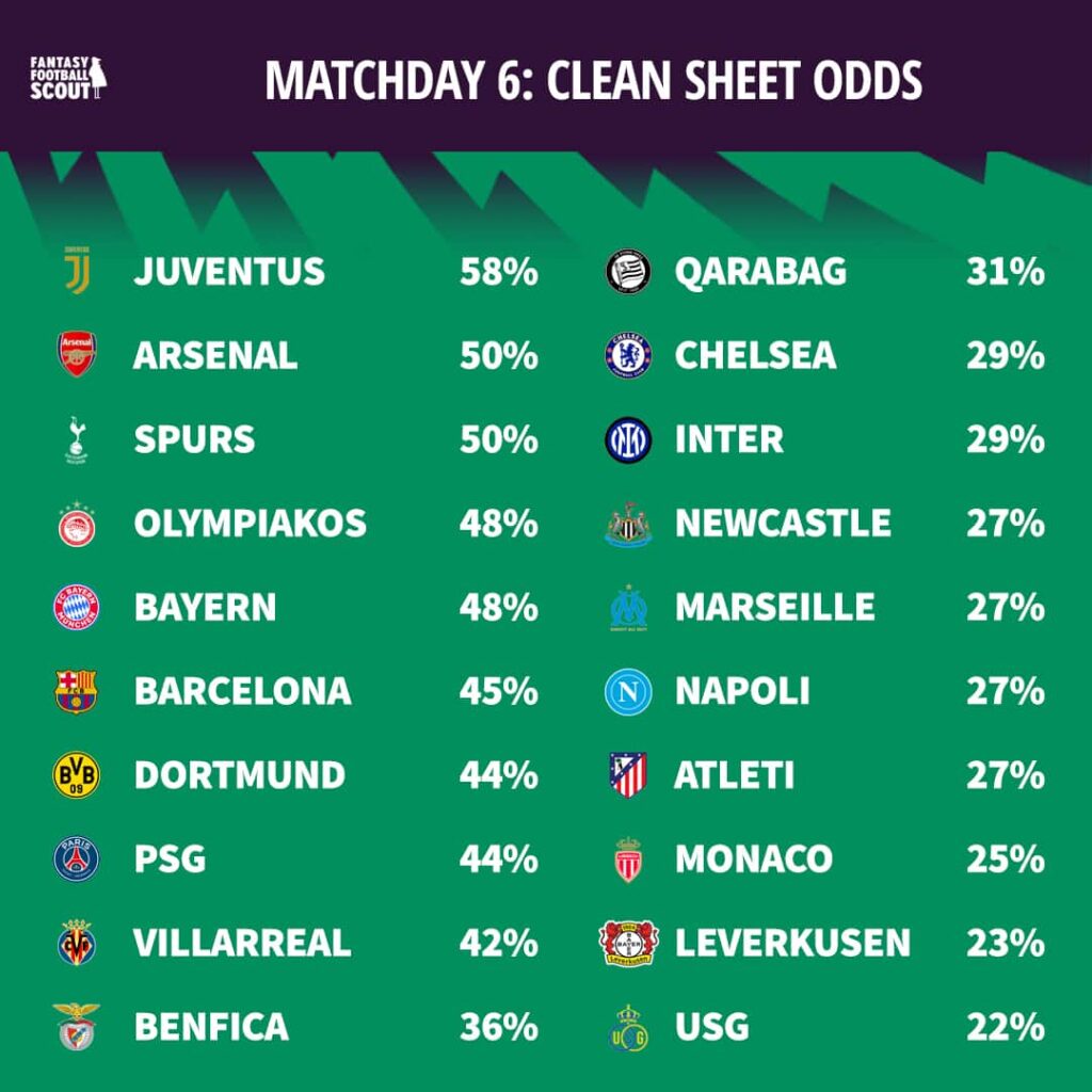 Juventus lead the clean-sheet odds for Matchday 6 at 58%. They host Champions League newcomers Pafos, who failed to score against both Olympiakos and Kairat. The Italian side have a clear opportunity to lock in another shutout.