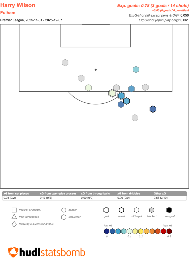 As for the underlying stats, Wilson has combined 14 shots (see image below) with six chances created over the last six Gameweeks, so he’s clearly doing plenty right from an attacking standpoint, even though none of his attempts have been deemed ‘big chances’.