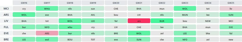 It is worth mentioning that Brentford sit top of the Fixture Ticker until Gameweek 25, if you fancied Nathan Collins (£4.9m) or Sepp van den Berg (£4.5m) instead. However, I still think Fulham and Everton are better defences in general.
