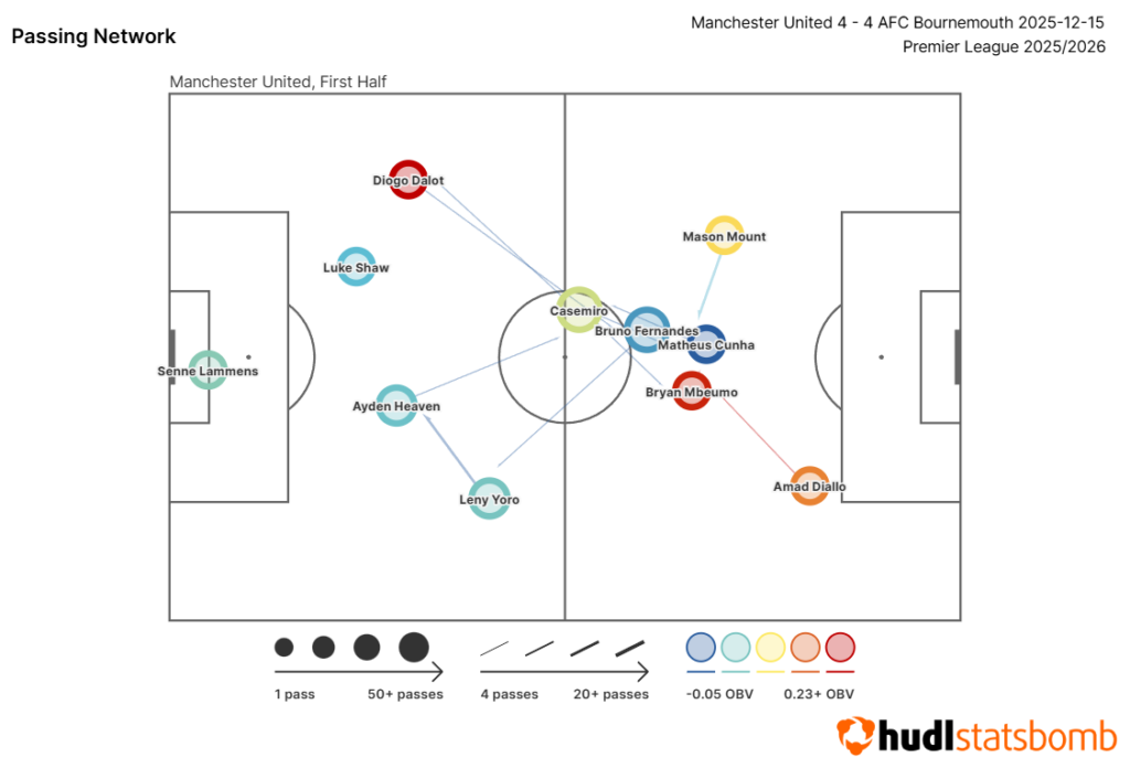Instead of a 3-4-2-1 on the ball, it was more 4-4-2/4-2-4. Where one ‘wing-back’, Diogo Dalot (£4.4m), became more of a full-back, the other, Amad Diallo (£6.3m), pushed right up the, er, right to become a winger. Often, when attacking, United had a frontline of Amad on the right, Mason Mount (£7.9m) on the left, and Bryan Mbeumo (£8.2m) and Matheus Cunha (£7.9m) through the middle.