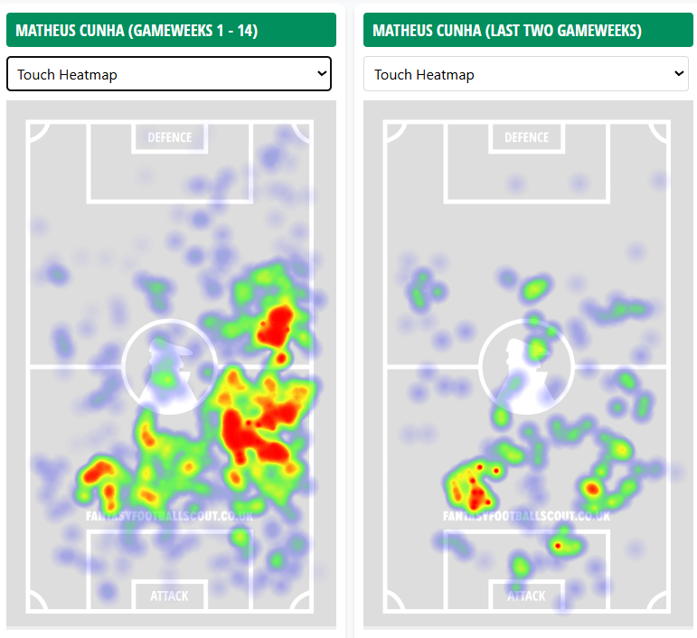 The Brazilian has taken up plenty of more central, threatening positions in the last two Gameweeks. Having had only one ‘big chance’ in the first 14 Gameweeks, he’s had three in the last eight days.