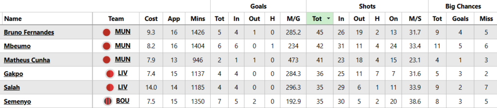 United, remarkably, now boast FPL’s top three midfielders for shots in 2025/26: