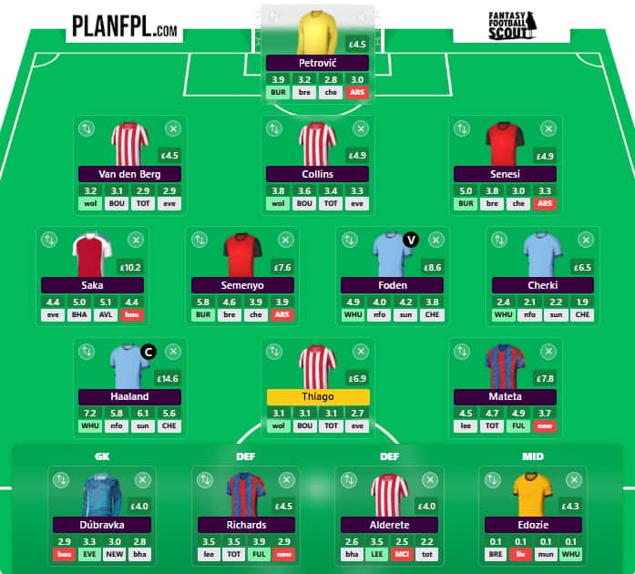The draft covers most bases effectively. A Manchester City triple-up of Erling Haaland, Phil Foden, and Nico O’Reilly is likely to feature heavily, alongside reliable Arsenal coverage through David Raya (£6.0m) and Bukayo Saka (£10.2m).