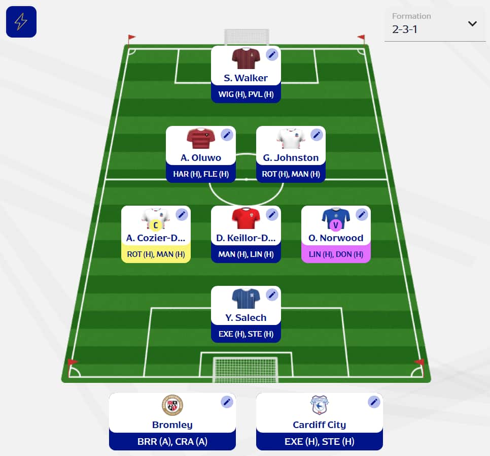 - In midfield, Oliver Norwood comes in as an all-round option. He takes set pieces and penalties and should tick along nicely during a busy period. Amario Cozier-Duberry stands out as a top pick this week, with two home fixtures against weak opposition and clear upside. Davis Keillor-Dunn completes the midfield as another high-ceiling option who can deliver returns.