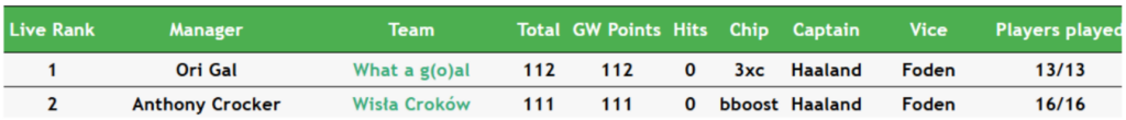 • 1st (1st) Ben Crellin (Triple Captain Haaland, OR 223k)