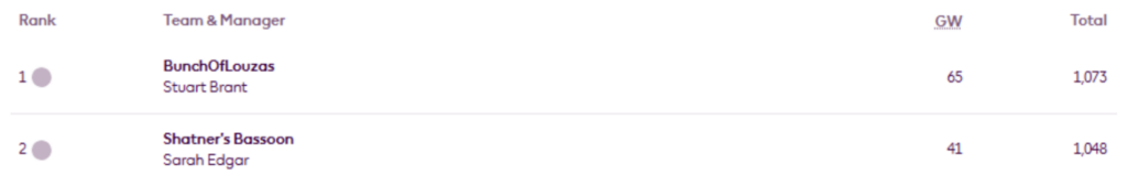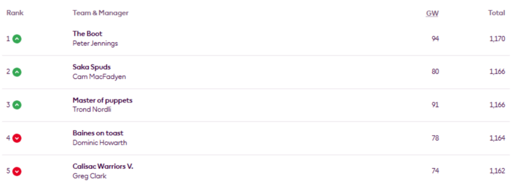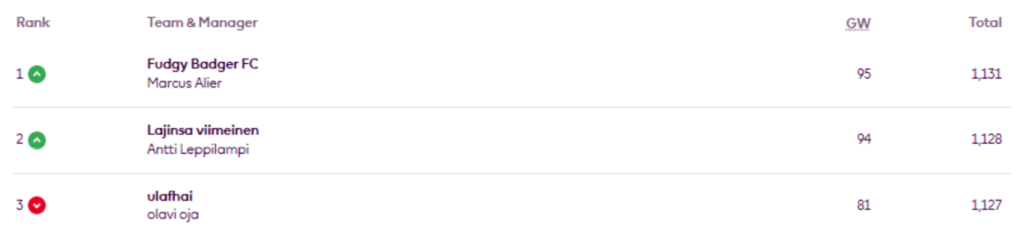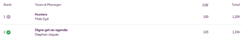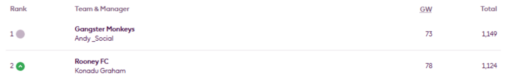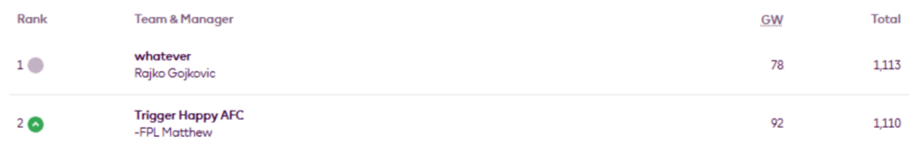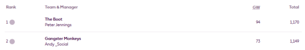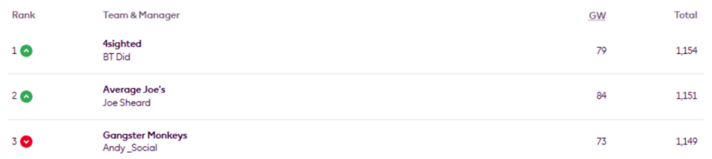 The league tables in MIR’s FFS Head-to-Head Leagues still show positions as they stood after Gameweek 12 - we will have to wait a little longer for the data from Gameweek 13 onwards to be added. I will now stop reporting on League 1 till the league tables have been updated and I know who’s leading.