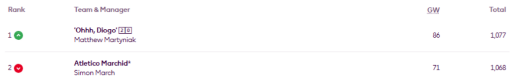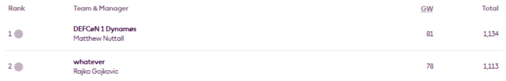 Once updated, we’ll be able to see whether leader Ville Tuominen (Santigold) has been overtaken in League 1 of MIR’s FFS Head-to-Head Leagues, after losing his latest match 81-86 to Ahmed Shahin (Professor Bear).