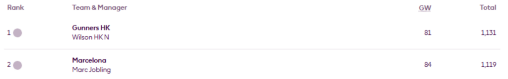 Wilson HK N leads the Beat the FFScout/PFT XI mini-league (code adzbaa) for a fifth week and is now 4,172nd overall.