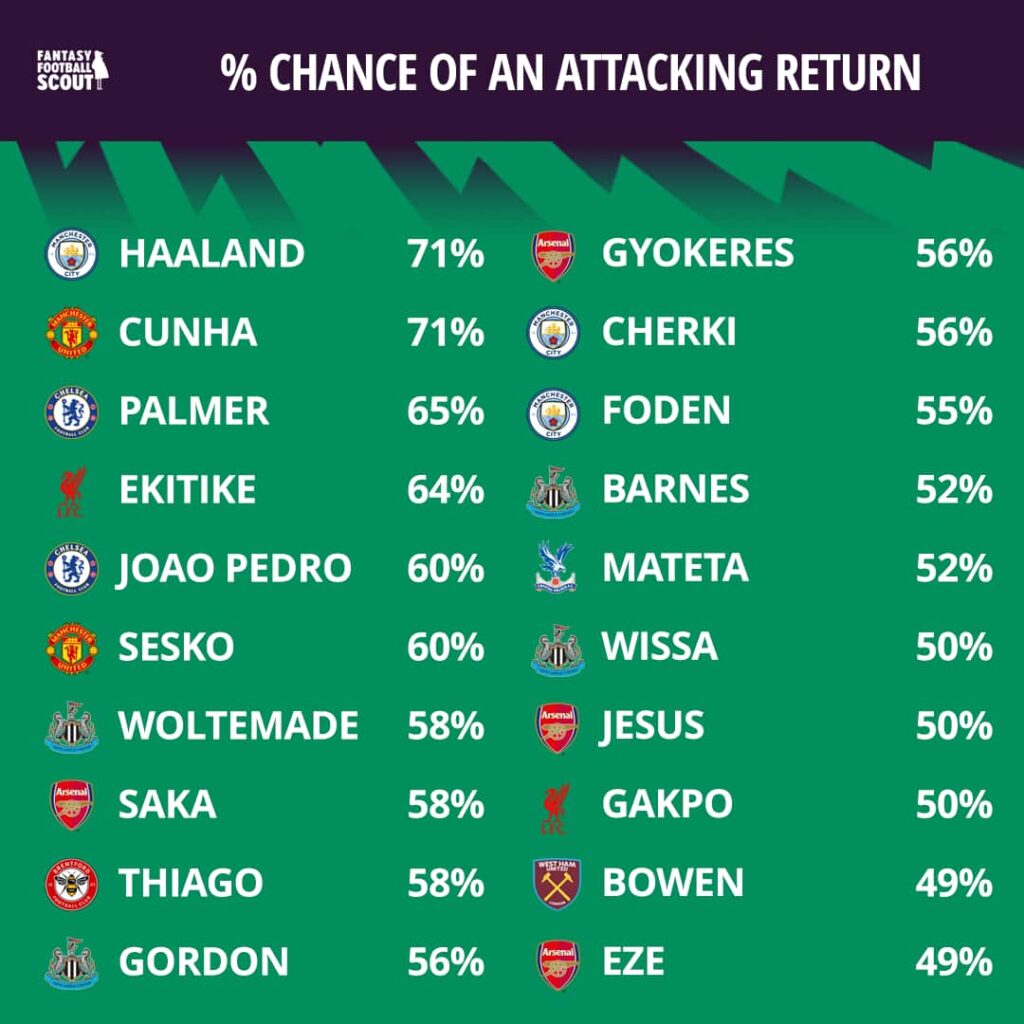Sitting between the Chelsea pair is Hugo Ekitike (£9.1m), who comes in with a 64% chance of a return. The Liverpool forward has quickly become one of the most popular picks in the game. After delivering in his latest appearance, a home clash with Leeds United looks like a strong opportunity to build on that Gameweek 18 assist.