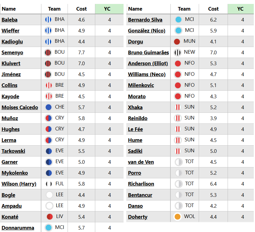 Semi-popular budget midfielders Harry Wilson (£5.8m), Elliot Anderson (£5.3m) and Moises Caicedo (£5.7m) all joined those on four bookings at the weekend.