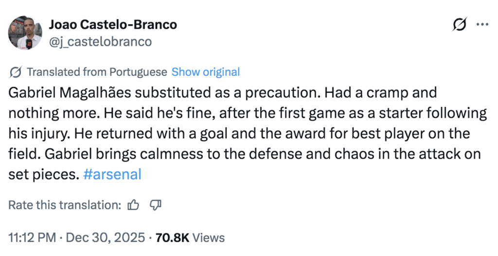 The only concern was that Gabriel was indeed taken off in the 77th minute, although thankfully, it does sound precautionary.