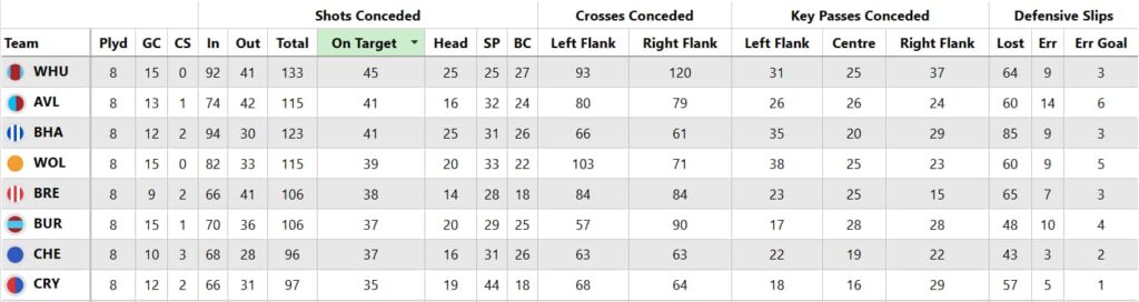 Since then, things have changed quite dramatically for the Palace defence. As well as picking up just two clean sheets, they now rank among the worst eight sides for attempts on goal conceded.